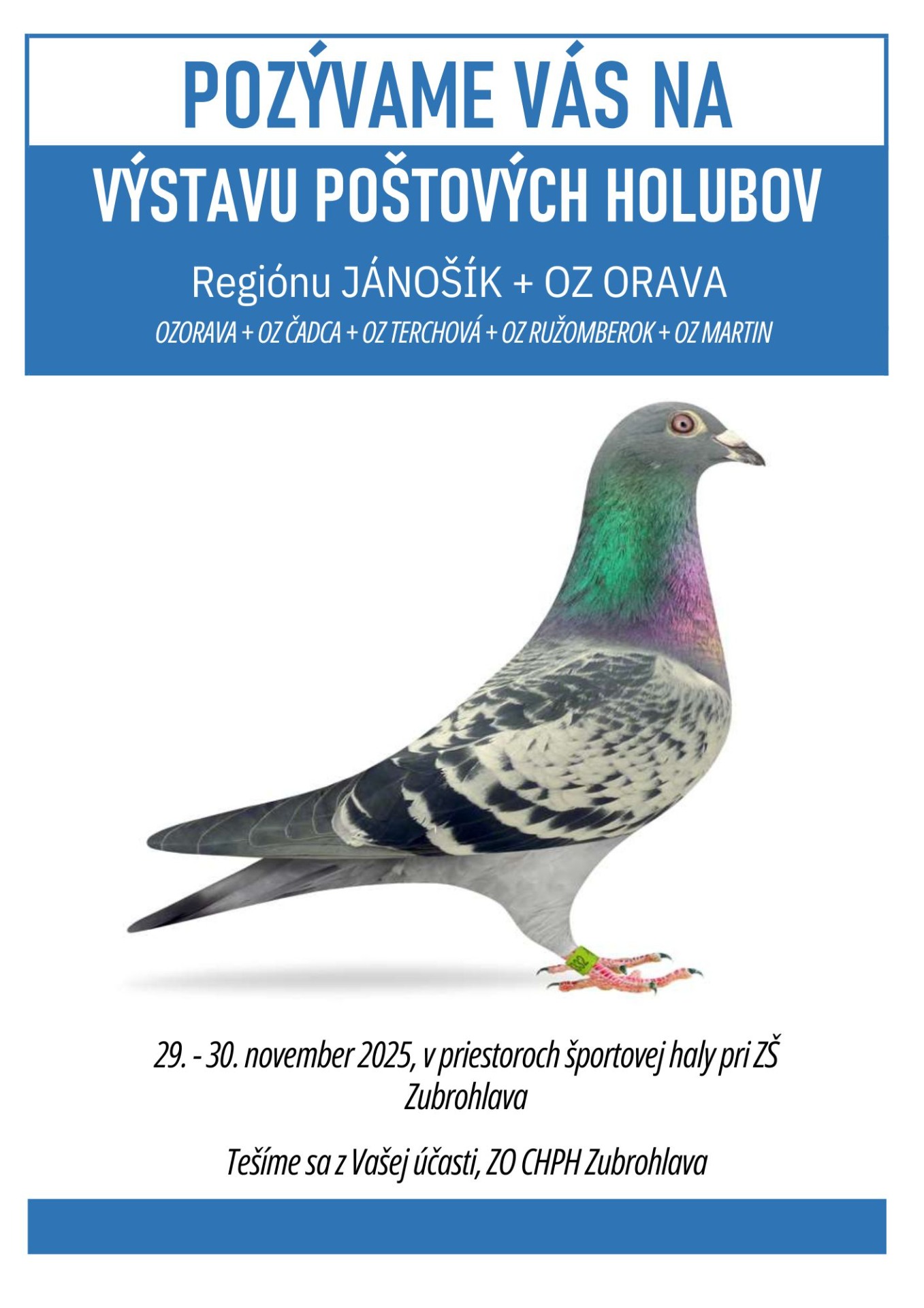 Výstavný výbor OZ ORAVA+Región Jánošík srdečne pozýva na výstavu, ktorá sa uskutoční v dňoch 29.11-30.11.2025 v športovej hale pri základnej škole v Zubrohlave. Všetci ste srdečne vítaní.