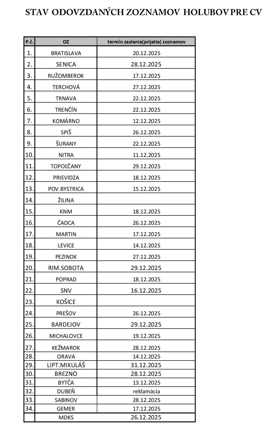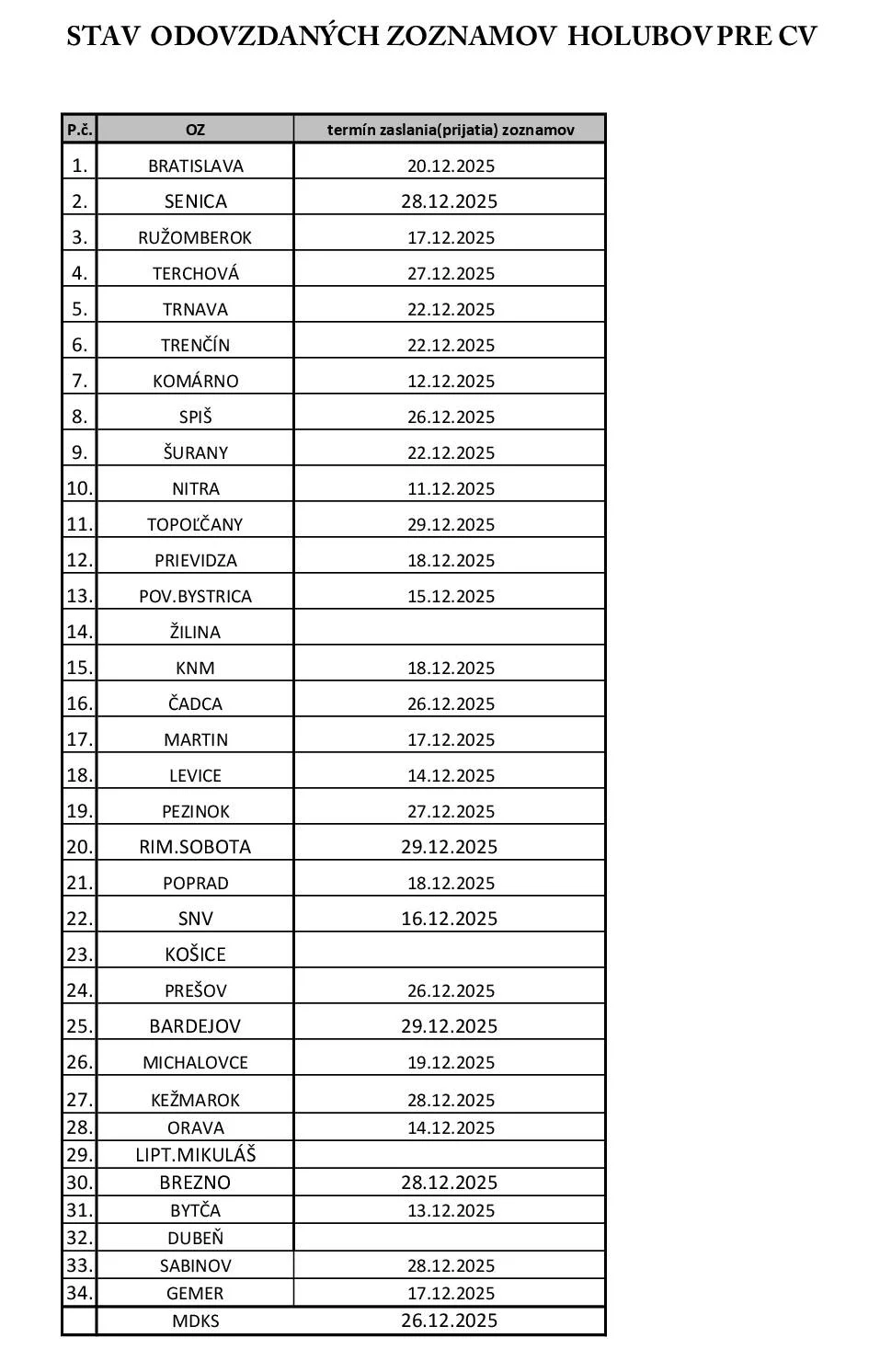V priebehu niekoľkých hodín budem spätne tým, ktorí posielali mne zoznamy, zasielať zoznamy holubov na CV pre jednotlivé OZ. Doplňte si na svoje karty čísla klietok uvedené v zoznamoch a tým zjednodušite a sprehľadnite umiestnenie holubov pri preberaní v sobotu.