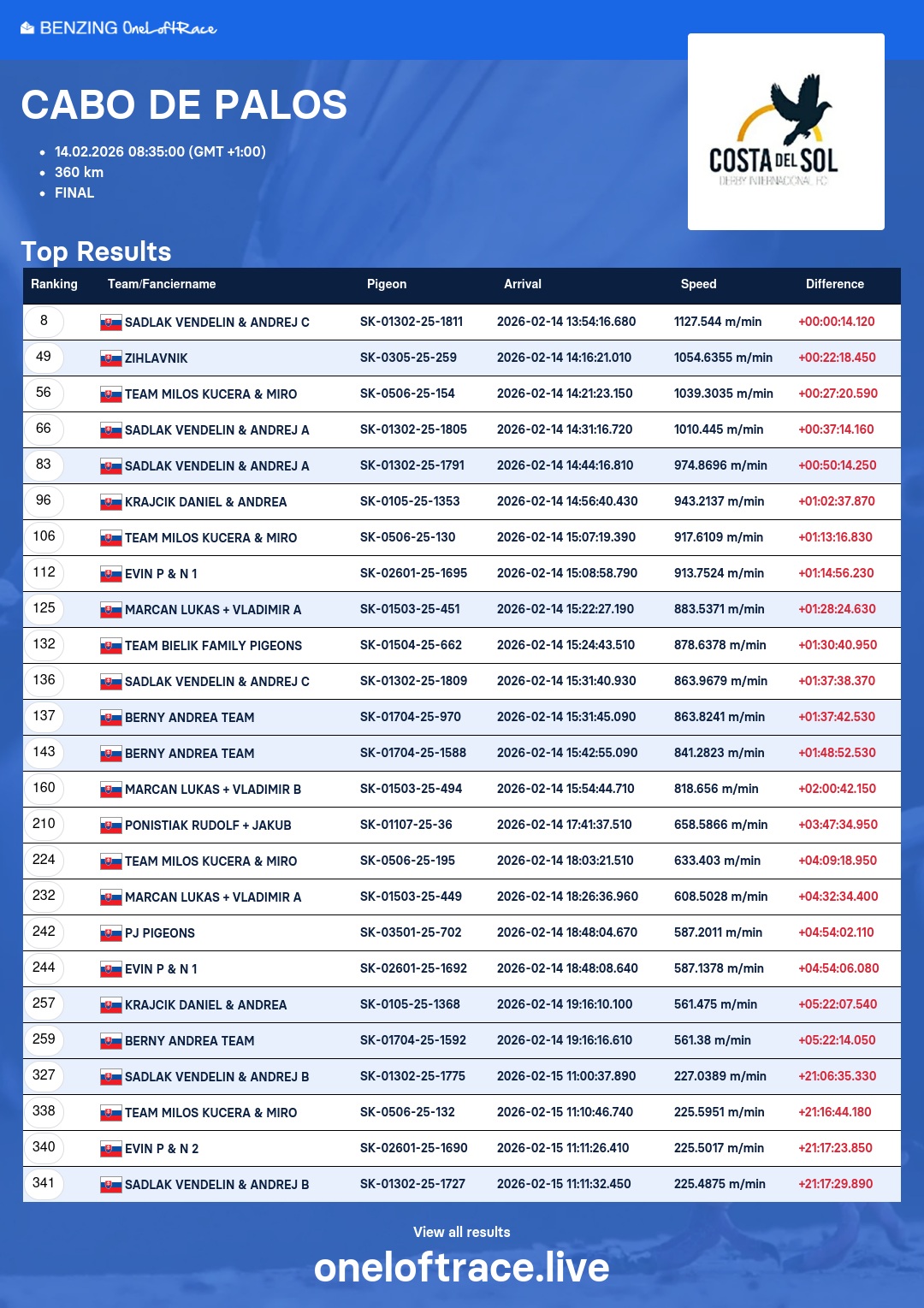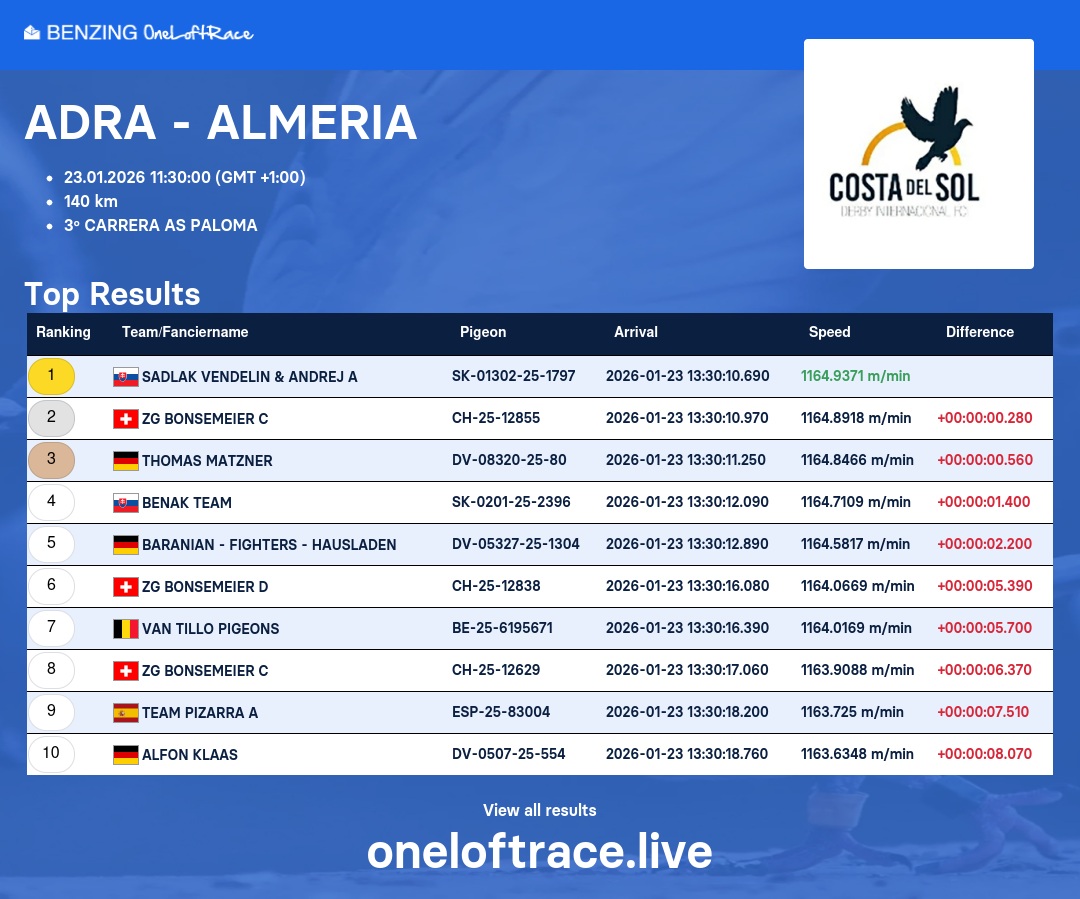 Slovenskí chovatelia sa po mnohých a mnohých úspechoch v tejto testovacej stanici v minulých rokoch (zimných i letných edíciách) opäť nestratilo - viď. výsledky: https://oneloftrace.live/lofts/130?season=2875&tab=flights