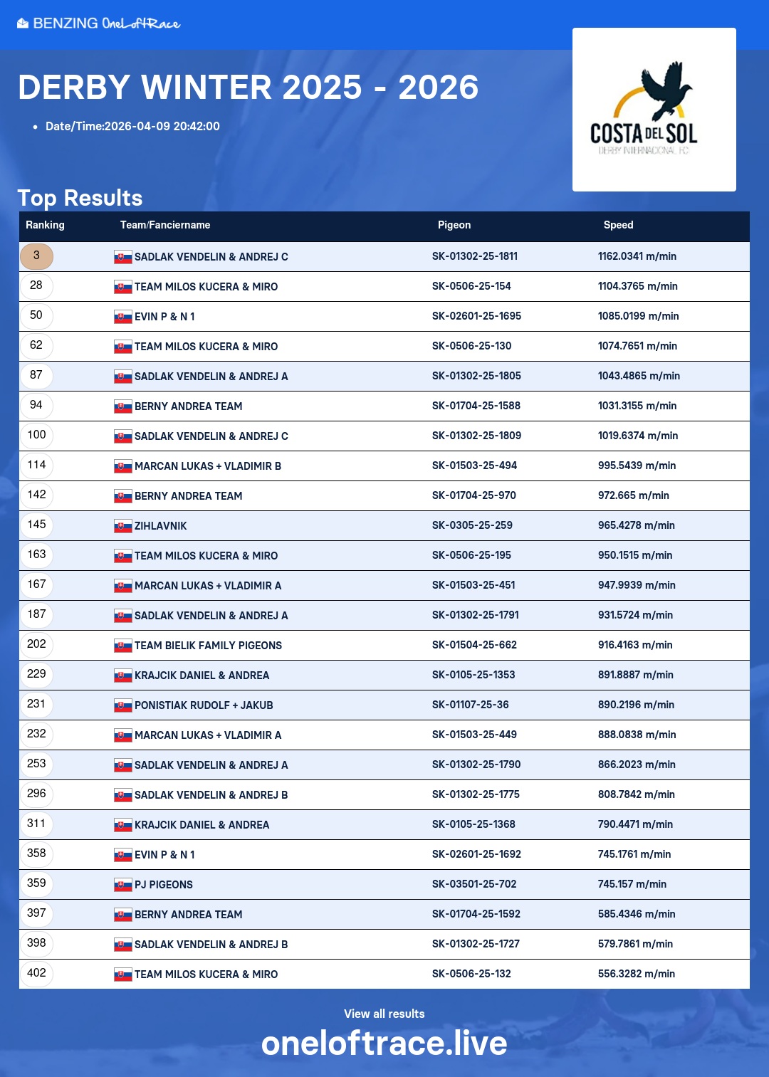 Zimná edícia ročníka 2025/2026 TS Derby International Costa Del Sol v Španielsku bola tento rok v znamení spravodlivého seminfinálového i finálového preteku. V oboch pretekoch rýchlosť prvých holubov bola pod 1150 m/min.