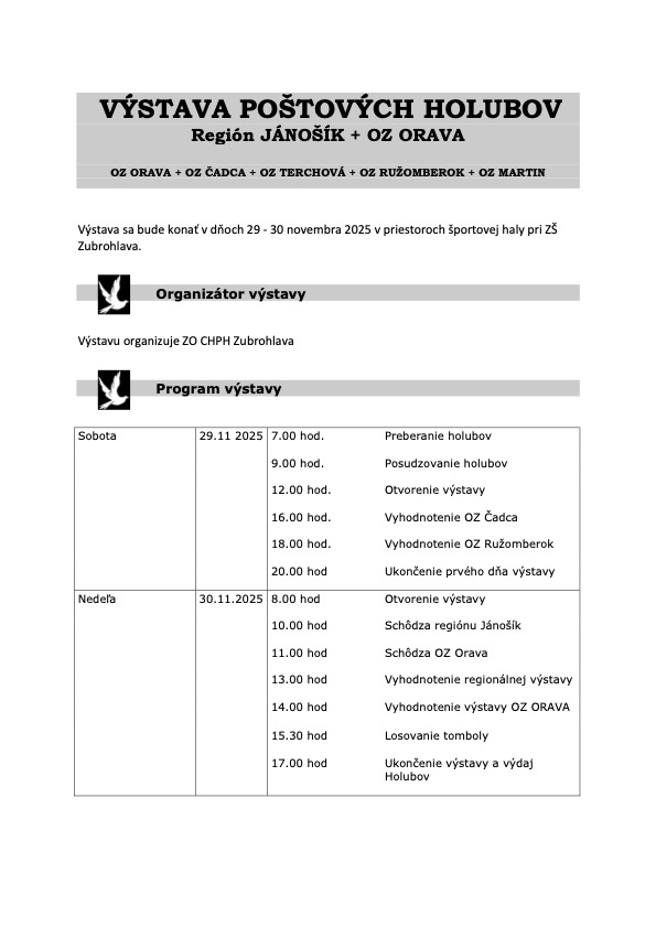 Výstava poštových holubov regiónu Jánošík + OZ Orava 29-30. nov. 2025